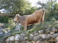 After breakfast and devotion, in which I was unexpectedly asked to give my testimony, we headed out and took the scenic route to Mt. Tabor - the Mount of Transfiguration. I've wanted to go there for so long and, oh, it was truly beautiful. We didn't get to stay very long because they were closing (there seems to be a theme here), but it was worth it just to spend a little time there. It's very high up and the view is breathtaking - I must go there again soon. On the way up, we came upon a very peculiar sight: we saw a cow eating on the side of a cliff.